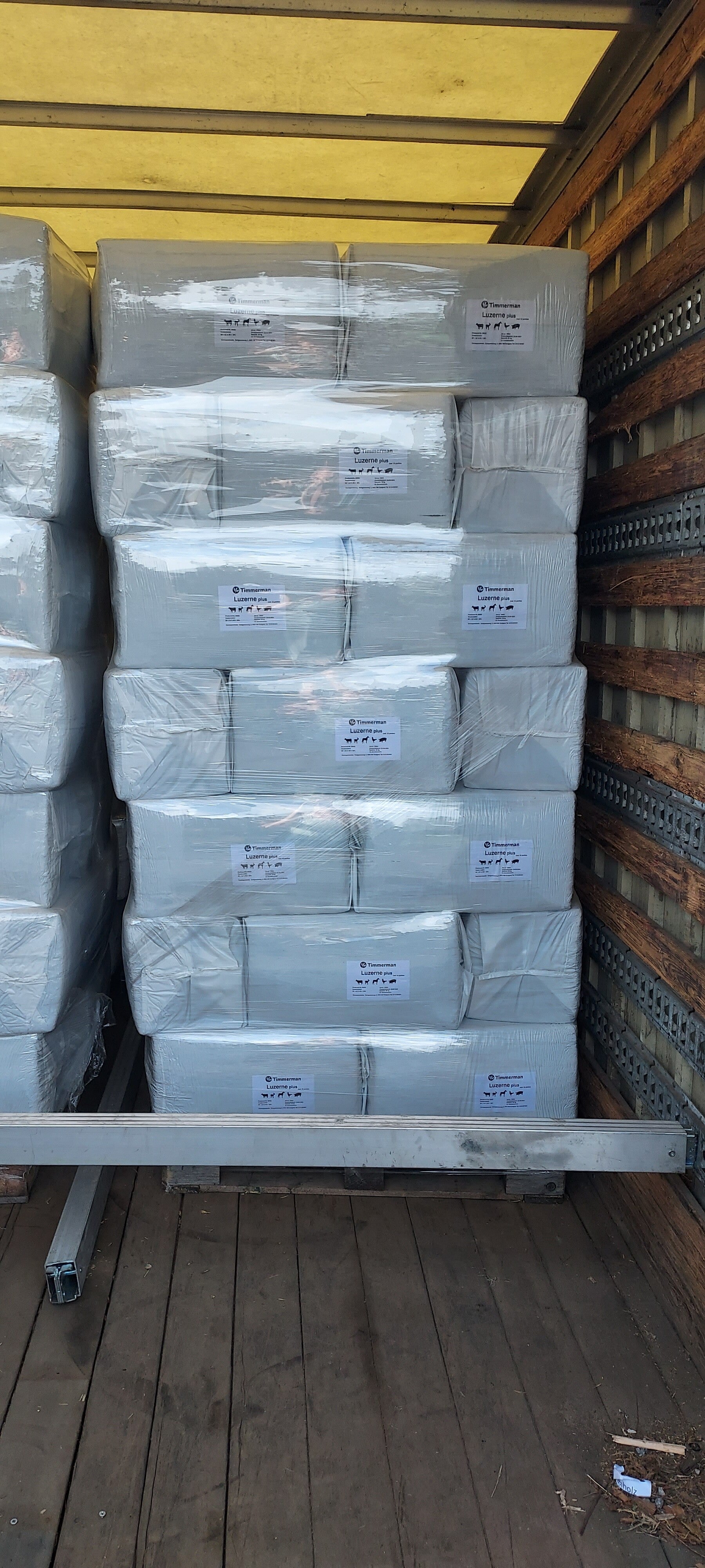 Er zitten 28 balen op een halve pallet.